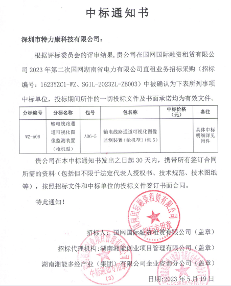 特力康中標(biāo)2023年第二次國網(wǎng)湖南省電力有限公司直租業(yè)務(wù)招標(biāo)采購可視化圖像監(jiān)測