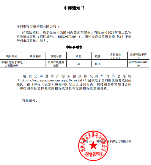 經依法招標,確定我司為國網內蒙古東部電力有限公司2023年第二次物資類招標采購(招標編號: HYCG -072303 ),測控及在線監測系統包15下表所列事項采購中標人。中標通知如下: