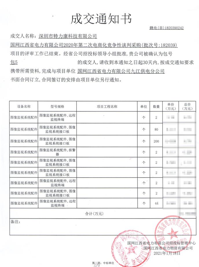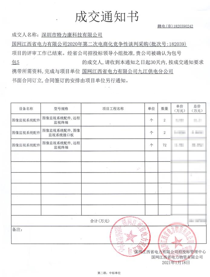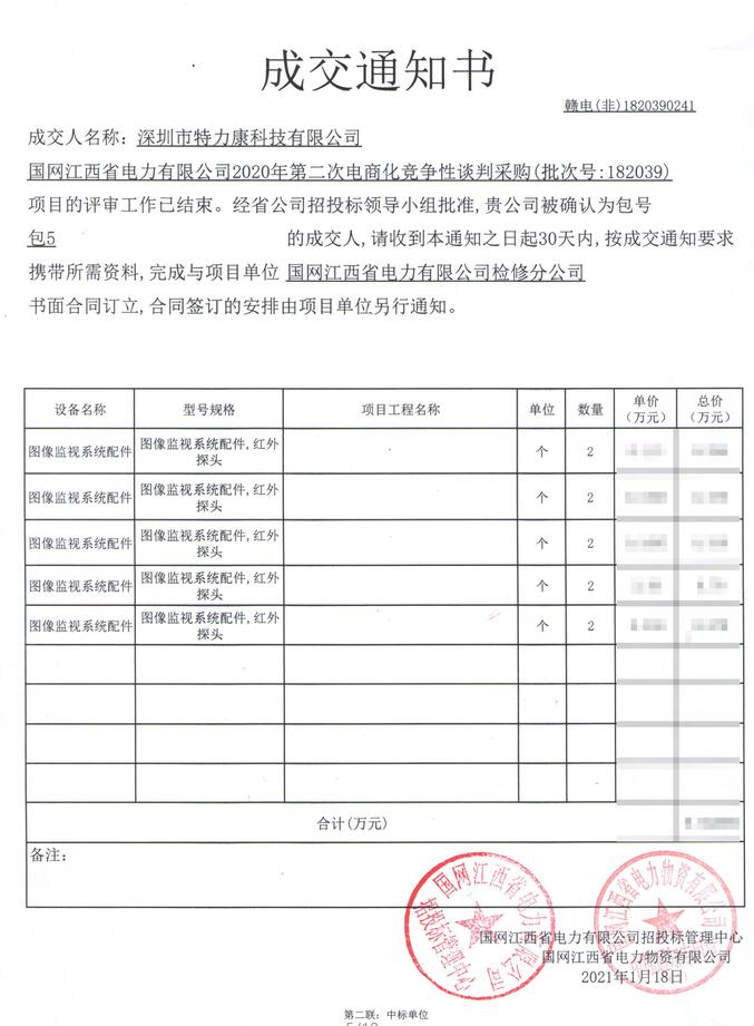 國(guó)網(wǎng)江西省電力有限公司2020年第二次電商化競(jìng)爭(zhēng)性談判采購(gòu)(批次號(hào):182039)項(xiàng)目的評(píng)審工作已結(jié)束。經(jīng)省公司招投標(biāo)領(lǐng)導(dǎo)小組批準(zhǔn),我司(深圳市特力康科技有限公司)被確認(rèn)為包號(hào)包5(圖像監(jiān)視系統(tǒng)配件)的成交人,成交通知如下: