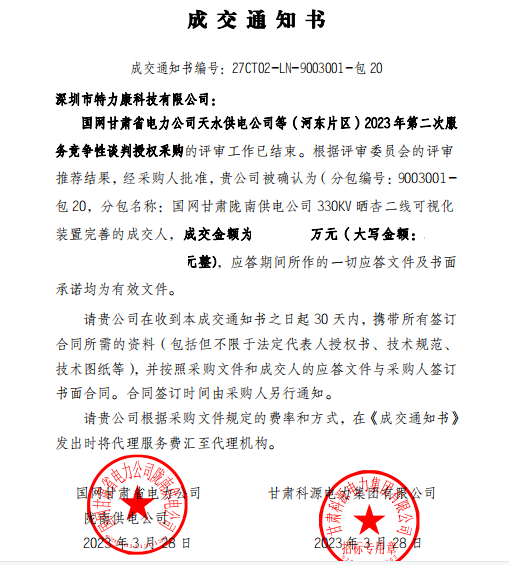國網甘肅省電力公司天水供電公司等(河東片區) 2023年第二次服務競爭性談判授權采購的評審工作已結束。根據評審委員會的評審推薦結果,經采購人批準,我司被確認為(分包編號: 9003001-包20,分包名稱:國網甘肅隴南供電公司330KV曬杏二線可視化裝置完善的成交人,成交通知書如下: